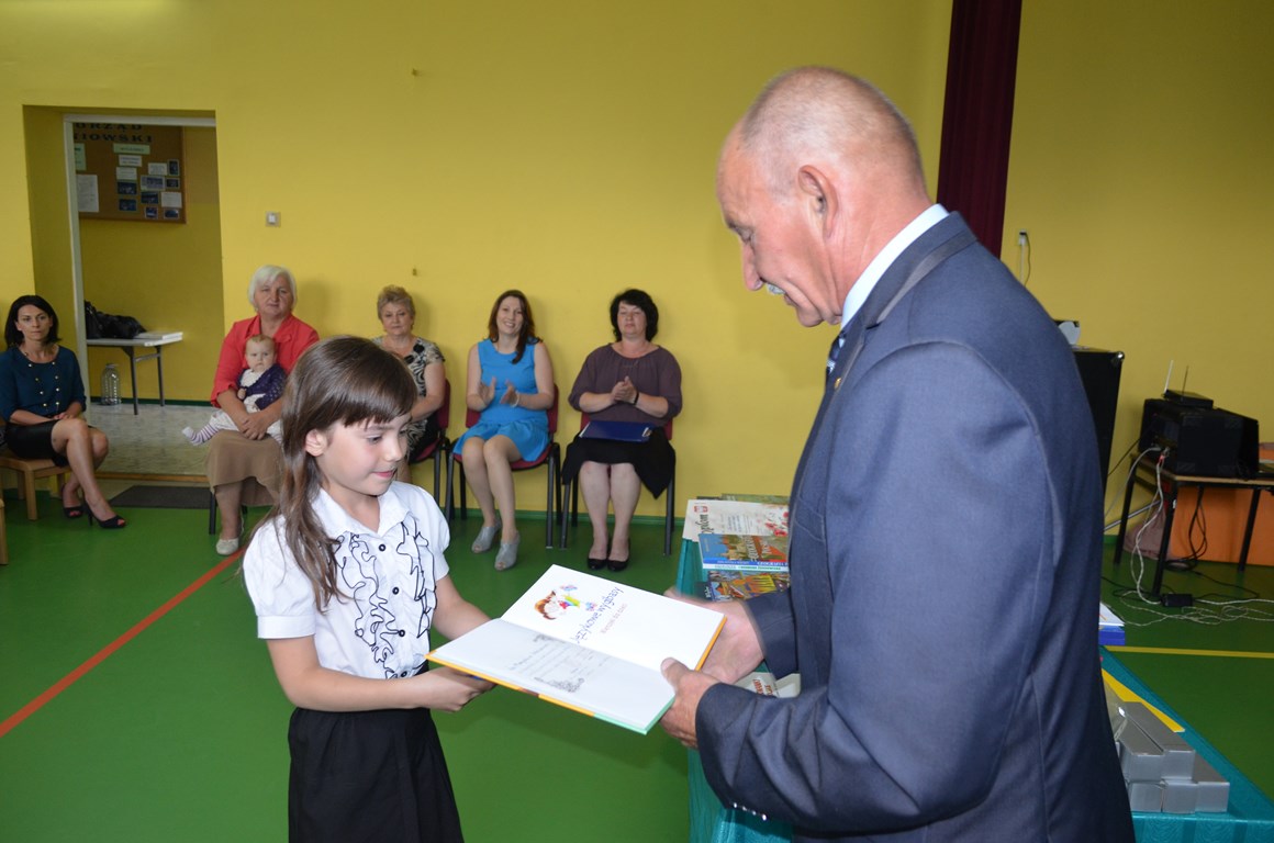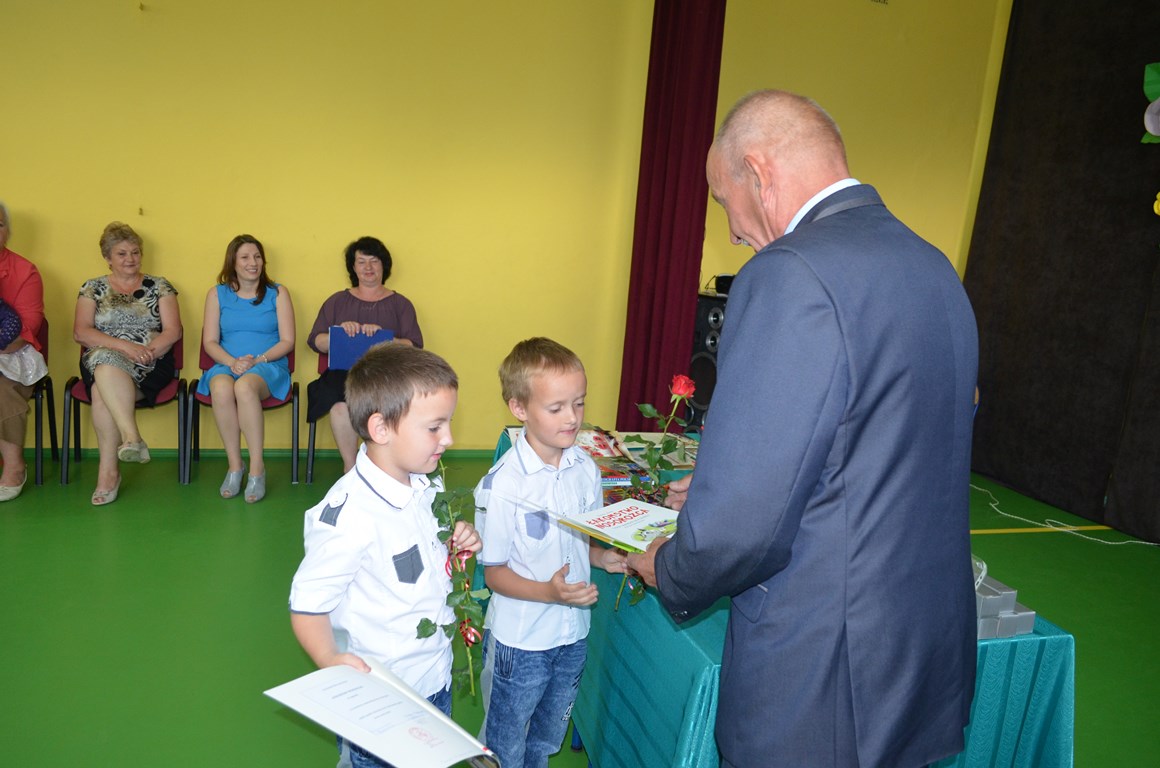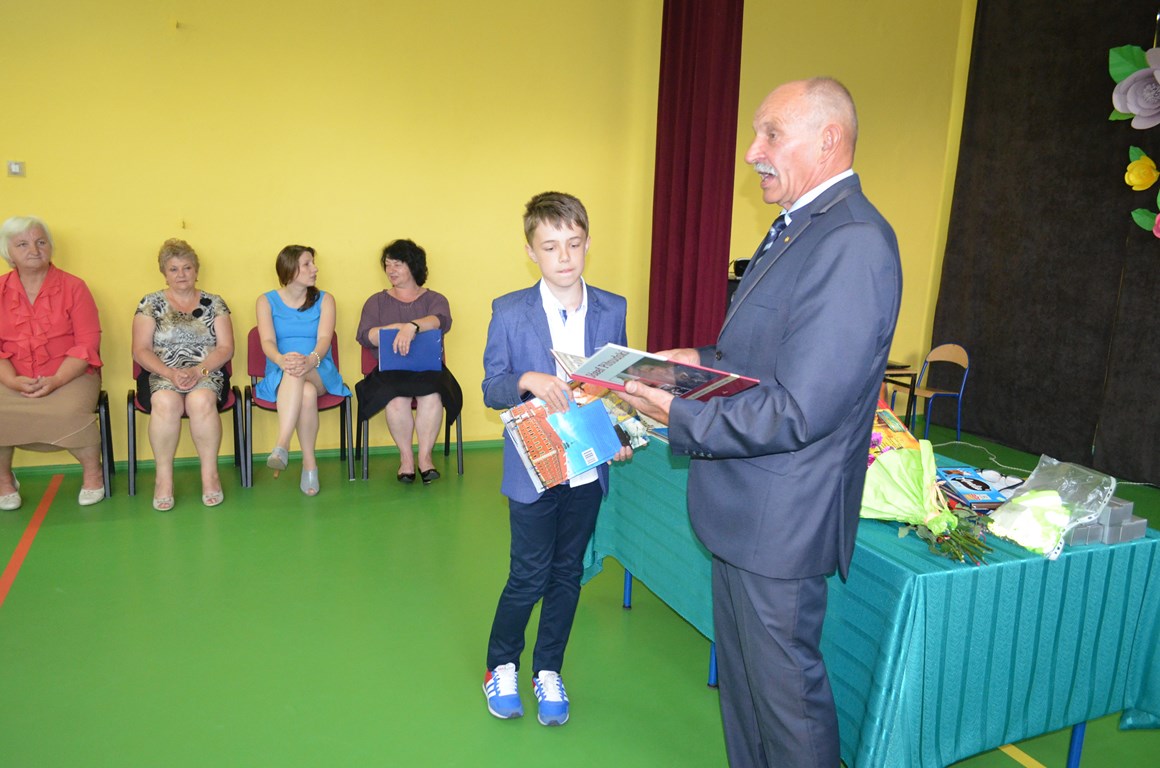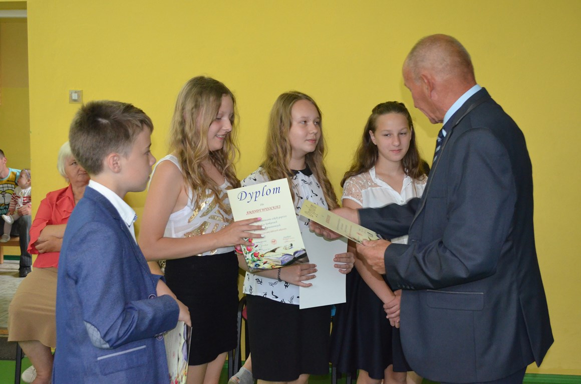 Pamiątkowe dyplomy oraz nagrody wręczyli Pan Wiesław Radzięciak - Wójt Gminy Leśniowice, Pan Stefan Prokop - Przewodniczący Rady Gminy Leśniowice oraz Pan Piotr Janiuk - Dyrektor Szkoły Podstawowej w Sielcu.
