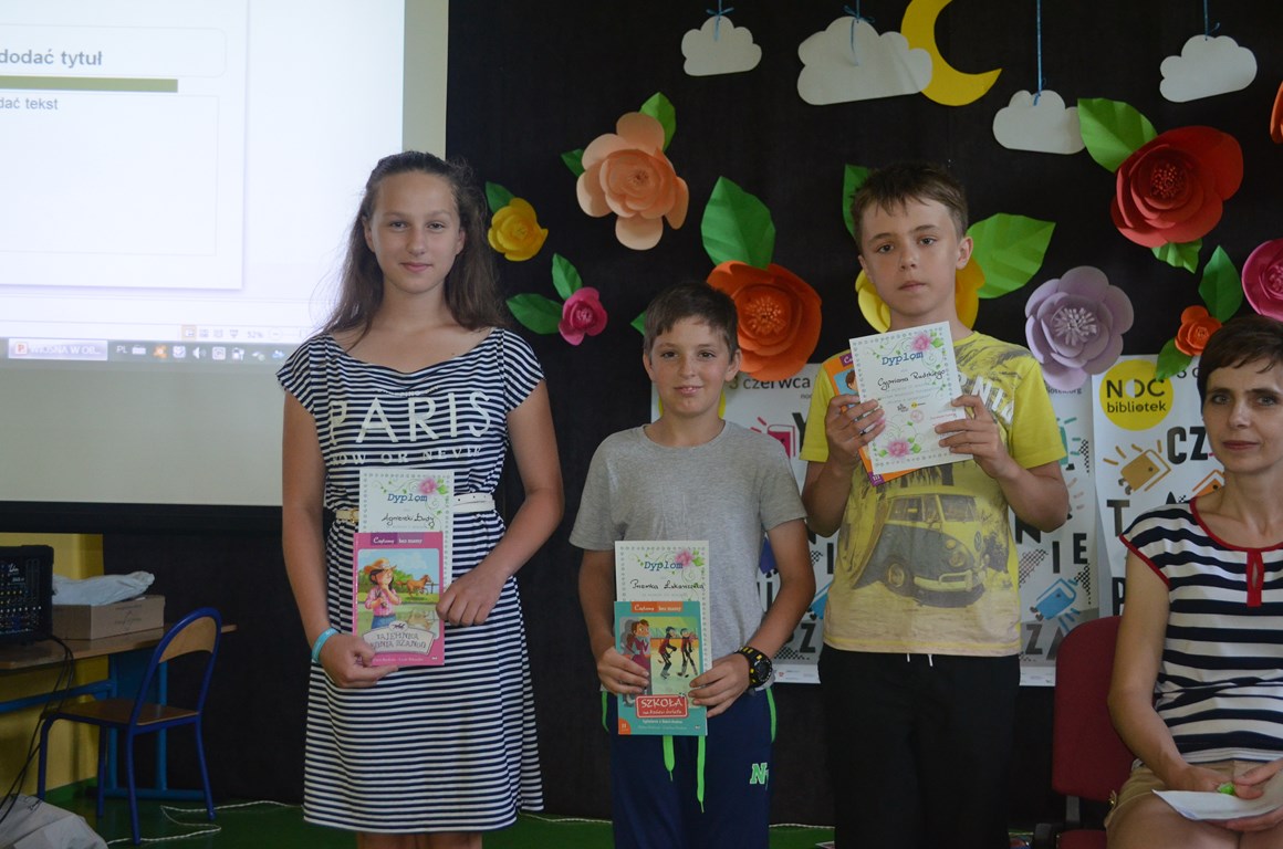 W konkursie wzięli również udział uczniowie naszej szkoły, a byli to Oliwia Gryciak, Cyprian Rudzki i Agnieszka Duda z klasy V. Przygotowywani pod czujnym okiem pani Diany Cichockiej poradzili sobie z testem rewelacyjnie! Oliwia zajęła zaszczytne V miejsce, a Cyprian VII. Oboje znaleźli się wśród grona laureatów i otrzymają nagrody oraz dyplomy. Gratulujemy im bardzo sukcesu oraz zamiłowania do książek, gdyż jak mówi noblistka, Wisława Szymborska „ Czytanie książek to najpiękniejsza zabawa, jaką sobie ludzkość wymyśliła”.