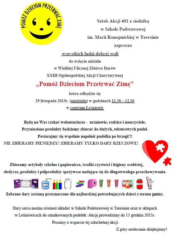 Jest nam niezmiernie miło poinformować, że Szkoła Podstawowa im. Marii Konopnickiej w Teresinie bierze udział w Akcji Pomóż Dzieciom Przetrwać Zimę. Nasz Sztab zarejestrowany jest w ogólnopolskiej bazie pod numerem 401. Link do oficjalnej listy sztabów: