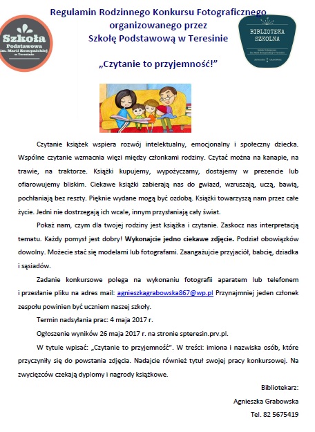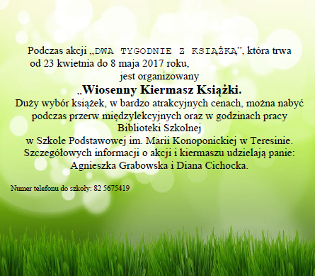 W drugiej połowie kwietnia, w Szkole Podstawowej w Teresinie została zorganizowana akcja "Dwa tygodnie z książką". Pani Diana Cichocka i pani Agnieszka Grabowska zaplanowały szereg bardzo ciekawych konkursów, happeningów i spotkań.
