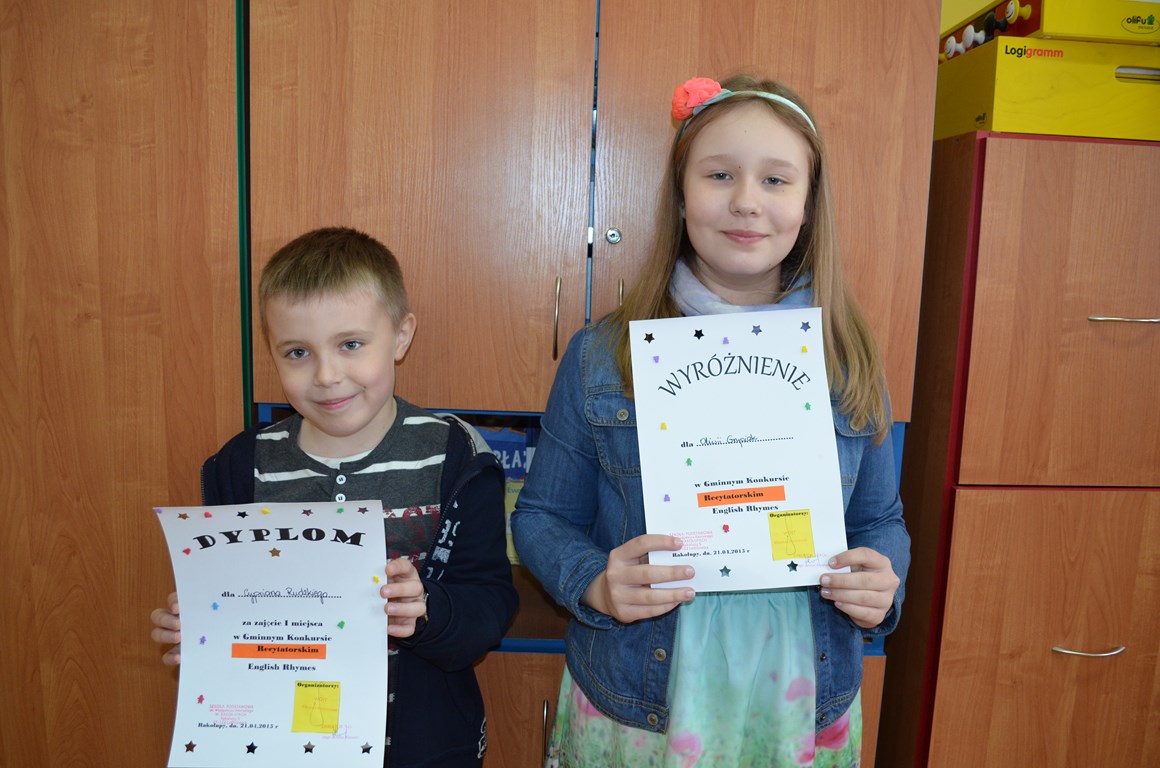 W dniu 21 kwietnia 2015 roku o godzinie 9.00 w Szkole Podstawowej w Rakołupach odbył się Gminny Konkurs Recytatorski English Rhymes. Uczniowie naszej szkoły zdobyli następujące miejsca: