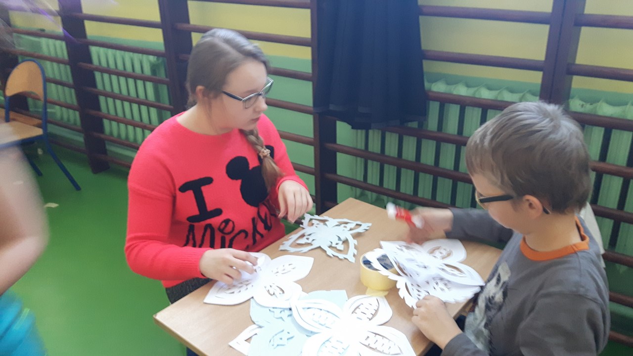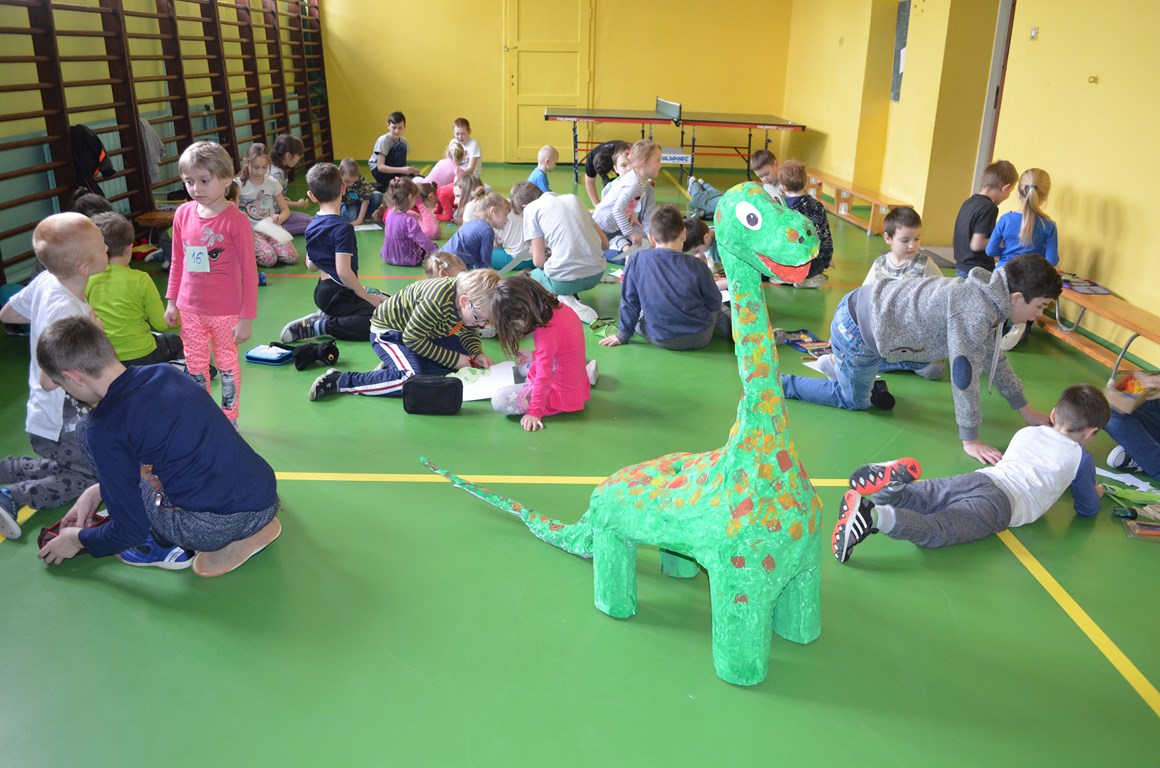Dzieci wykonywały w parach prace konkursowe. Starsi koledzy mieli za zadanie opiekować się młodszymi, dbać o ich bezpieczeństwo oraz dzielić się z nimi wiedzą i doświadczeniem. Po zabawach integrujących, rozwijających empatię i budzących zaufanie, uczniowie przystąpili do kolorowania i ozdabiania dinozaurów. W zgromadzonych na wystawce książkach dzieci mogły odnaleźć nazwy kolorowanych stworzeń i ciekawostki na ich temat. Uczniom przypomniano zasady korzystania z księgozbioru oraz zachęcono do częstszych odwiedzin w bibliotece.