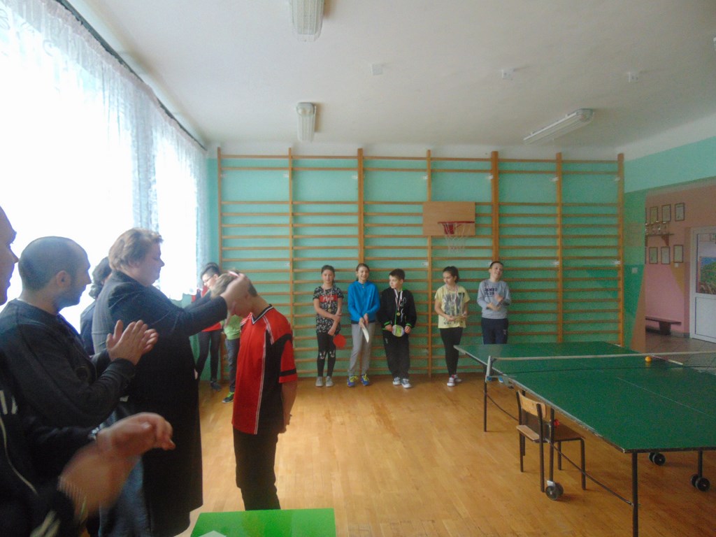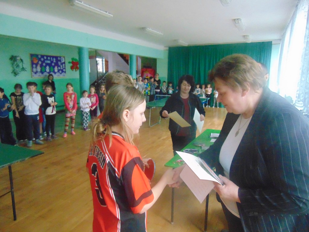 Na zakończenie wszyscy uczniowie zostali nagrodzeni słodkimi upominkami. Pary, które najpiękniej wykonały zadanie konkursowe, nagrodzono dyplomami i rakietkami do tenisa stołowego.