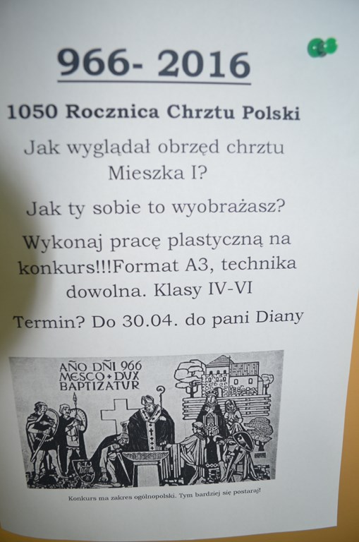 Taka lekcja historii, przeprowadzona przez Panią Dianę bardzo spodobała się uczniom. Zdobytą wiedzę postanowili wykorzystać uczestnicząc w ogólnopolskim konkursie plastycznym, organizowanym przez GWO pt. "Chrzest, czyli początek".