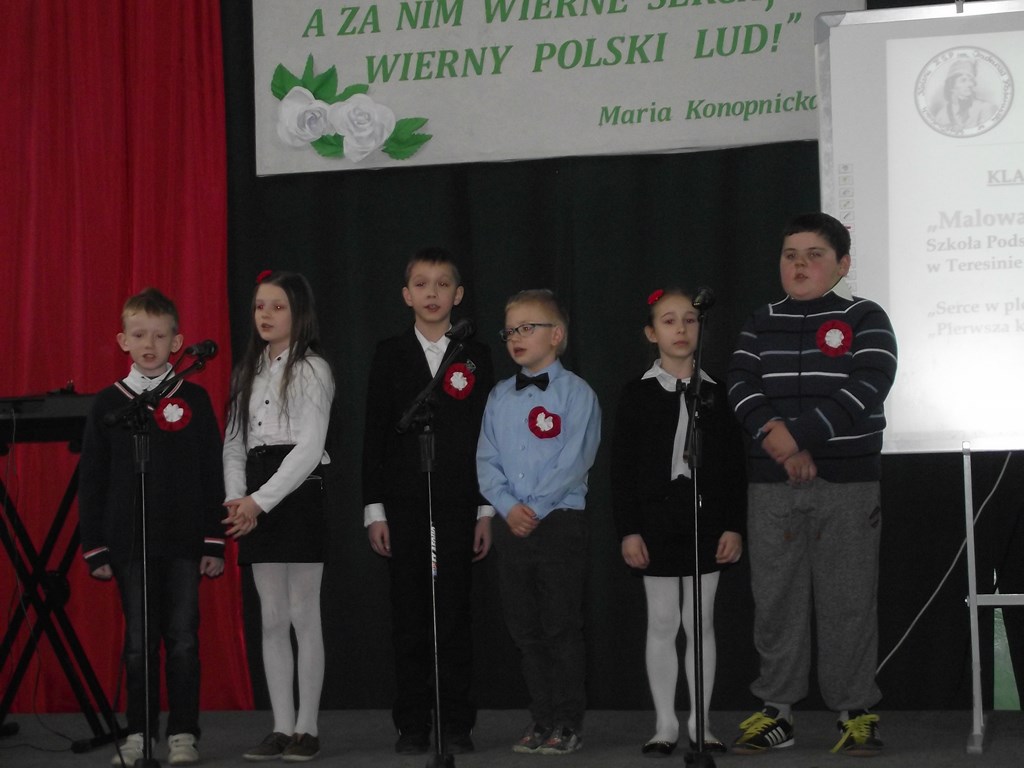 W kategorii soliści klas I-III reprezentował nas Alan Palczyński, który zaśpiewał „Zośkę” oraz „Jedzie, jedzie na Kasztance” i zdobył II miejsce. Zespół „Malowane Dzieci”, z klasy III zdobył zaszczytne I miejsce, a ich wykonanie „Pierwszej Kadrowej” i „Serca w Plecaku” ujęło profesjonalne jury.