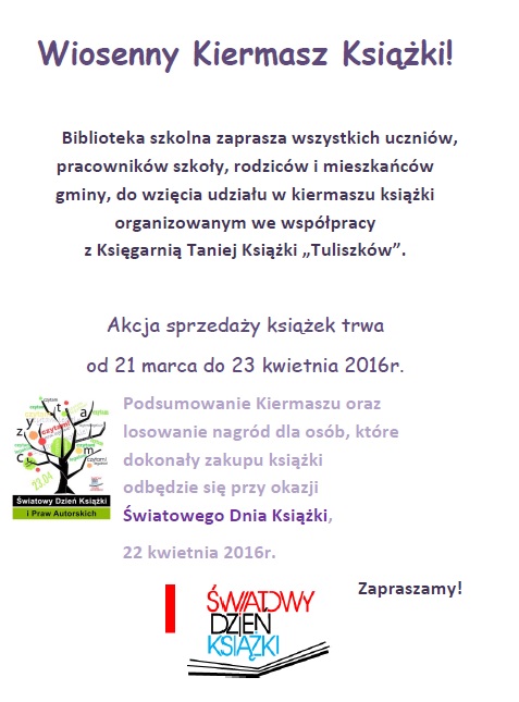 Pani Agnieszka Grabowska, w ramach pracy biblioteki szkolnej, zorganizowała kiermasz książki. Do nabycia są przepięknie wydane albumy, zbiory baśni i wiersze w bardzo niskich cenach. Celem akcji jest zachęcenie uczniów do czytania i powiększania swoich domowych biblioteczek. Zapraszamy do wzięcia udziału w kiermaszu wszystkie dzieci, ich rodziców i pracowników szkoły.