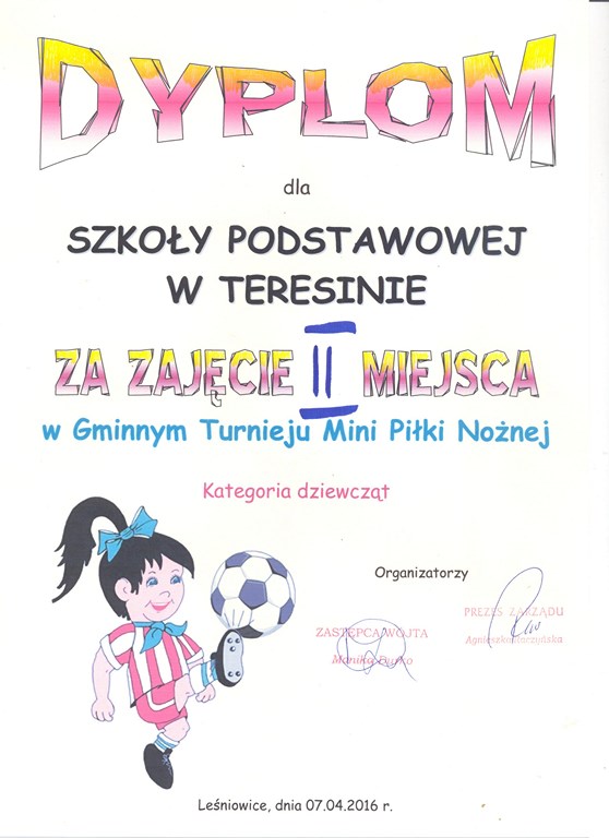 W dniu 7 kwietnia 2016 r. na boisku ,,Orlik" w Leśniowicach odbył się Gminny Turniej Mini Piłki Nożnej. W kategorii chłopców udział wzięły wszystkie cztery szkoły z terenu gminy, natomiast w kategorii dziewcząt wystąpiły trzy drużyny: SP w Leśniowicach, SP w Teresinie i SP w Sielcu. W kategorii dziewcząt II miejsce zajęła drużyna dziewcząt ze Szkoły Podstawowej w Teresinie, zaś w kategorii chłopców I miejsce zajęła drużyna chłopców również ze szkoły Podstawowej w Teresinie.