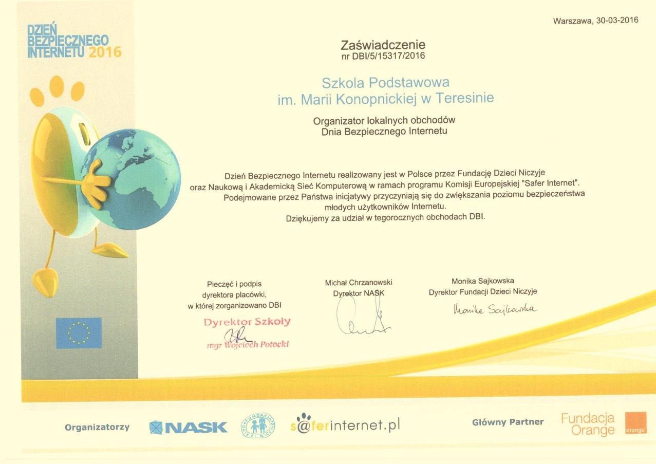 W ramach obchodów Dnia Bezpiecznego Internetu w Szkole Podstawowej w Teresinie odbyło się spotkanie dla wszystkich chętnych rodziców, dotyczące uwrażliwienia rodziców na problem nadmiernego korzystania przez dzieci z mediów elektronicznych i Internetu. Zaprezentowana została prezentację pt.: „Internet bez przesady”, czyli jak zapobiegać nadużywaniu internetu przez dzieci i młodzież. Omówione zostały specyfiki problemu, możliwych działań profilaktycznych i sposobów reagowania na podejrzenie uzależnienia dziecka od sieci.